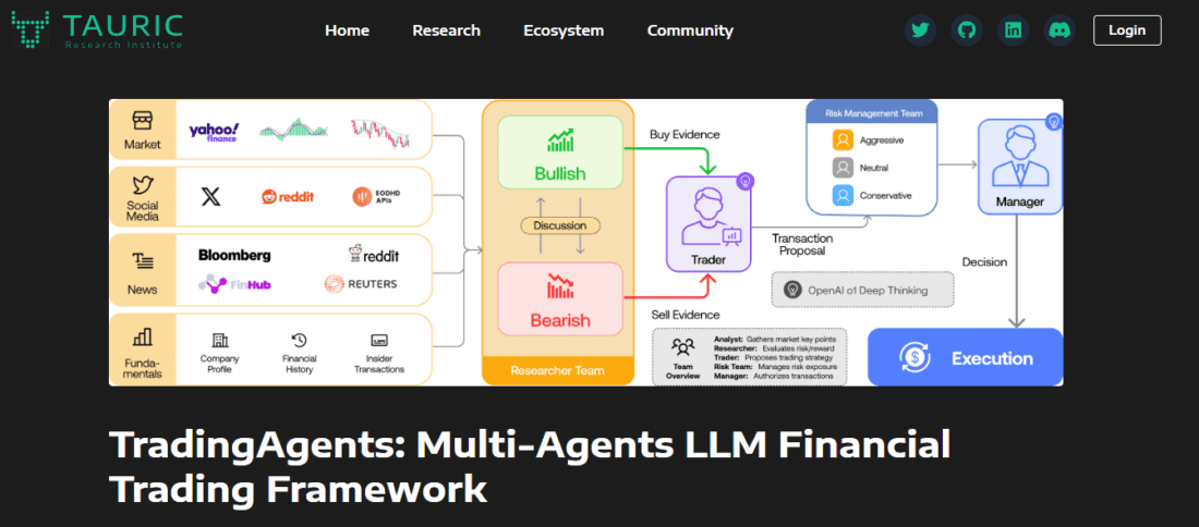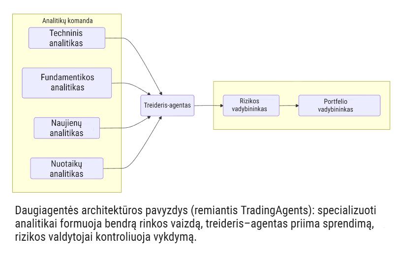 Pavyzdys – TradingAgents (Tauric Research) sistema. Ji suskaido prekybos procesą į etapus: keli analitiniai agentai analizuoja fundamentalius duomenis, naujienas, visuomenės nuotaikas ir techninius indikatorius; tada „tyrėjų“ grupė (optimistai/pesimistai) aptaria alternatyvius scenarijus; toliau treideris-agentas priima sprendimą dėl sandorių, o rizikos valdymo ir portfelio valdytojų komandos įvertina riziką ir patvirtina sandorius.