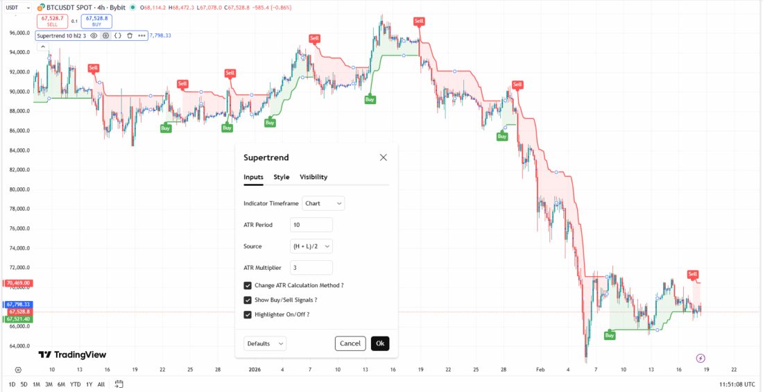 Supertrend prisitaiko prie volatilumo, nes ATR automatiškai praplečia/susiaurina atstumą priklausomai nuo to, kas vyksta rinkoje. Supertrend yra puikus trailing stop: jis leidžia prekiauti didžiąja dalimi trendo be per ankstyvo išėjimo.