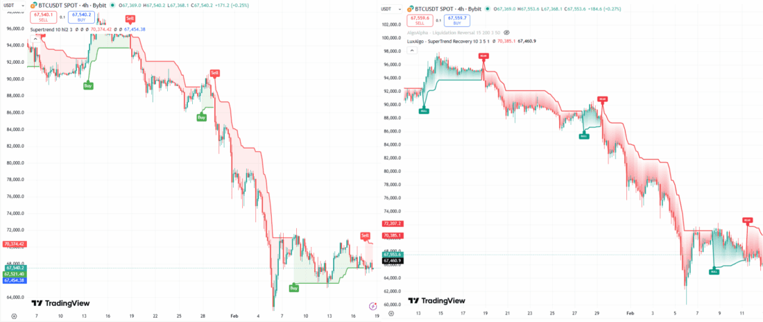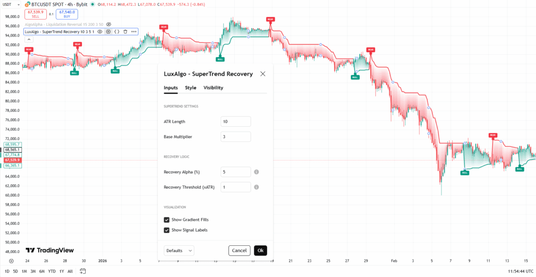 TradingView pateikia daug patobulintų Supertrend variantų. Vienas iš jų – SuperTrend Recovery nuo LuxAlgo. Indikatorius paskelbtas 2026 m. vasario 17 d. ir per pirmąsias parą surinko daugiau nei 4 tūkst. peržiūrų.