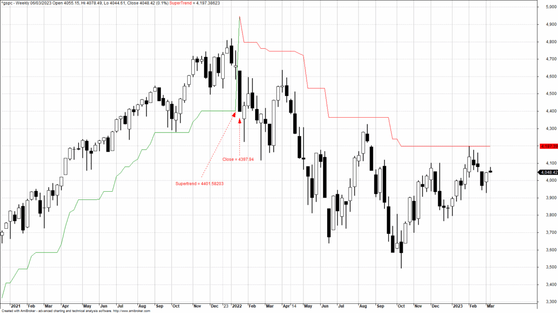 Grafike aukščiau (S&P 500 Weekly) matyti, kaip SuperTrend „sugavo“ visą 2021–2022 m. bulių trendą ir laiku išėjo 2022 m.