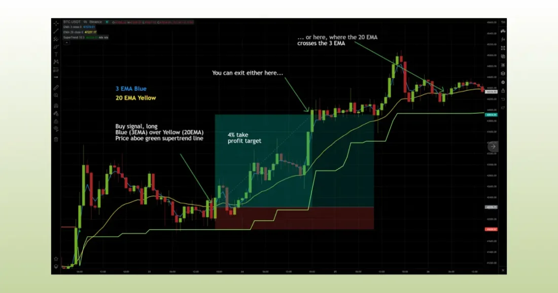 • Take Profit: trailing pagal SuperTrend arba kitas lygis.