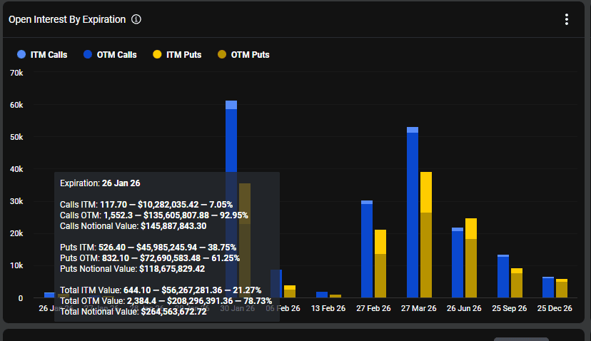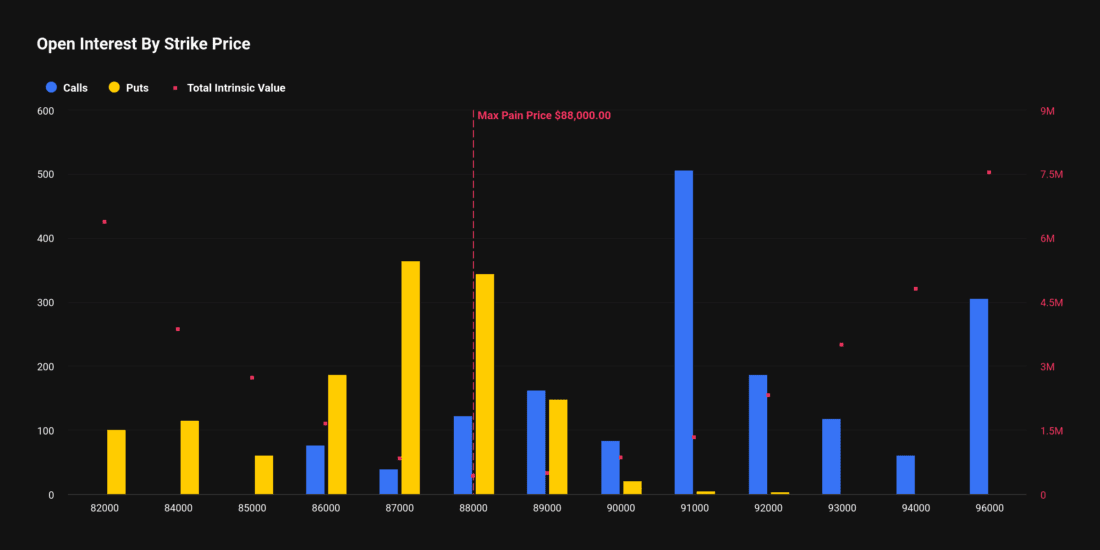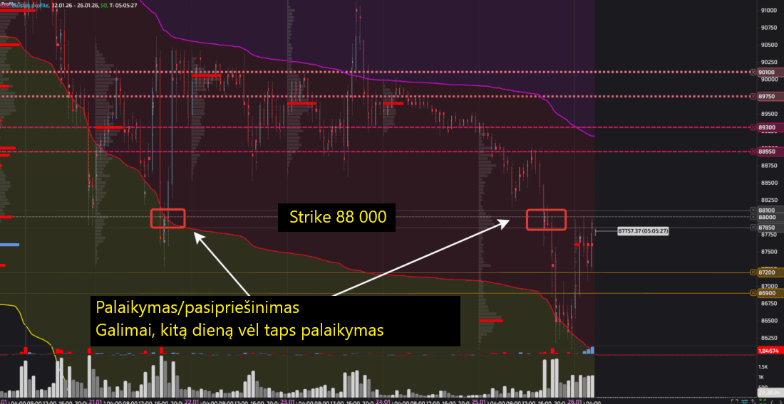 Štai gyvas pavyzdys. Dienos opcionas Deribit biržoje, kurio galiojimas baigiasi 2026 m. sausio 26 d., turi Max Pain ties 88 000 USD strike kaina.