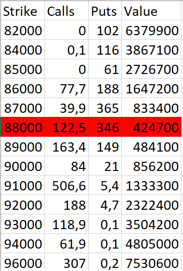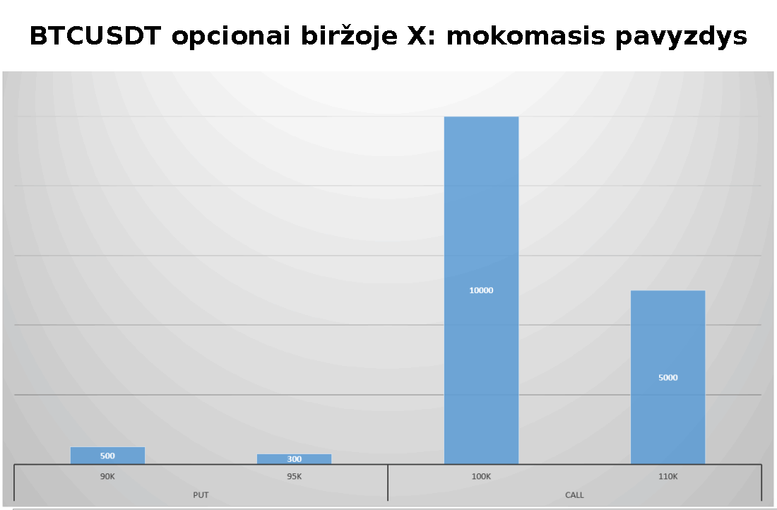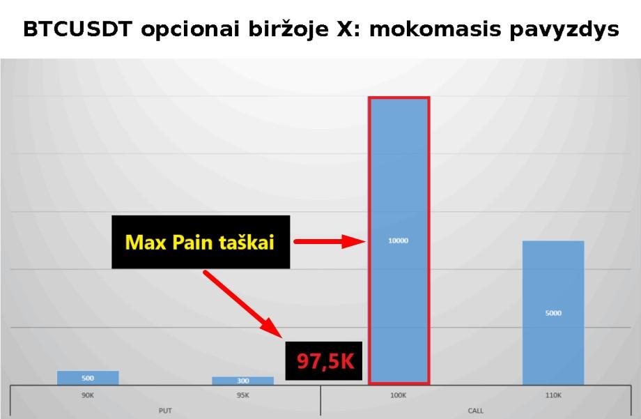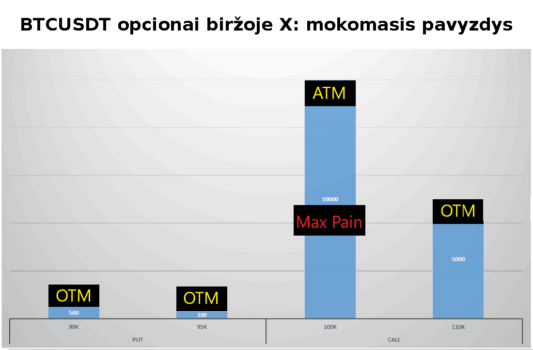 Esant 94 000 USD ekspiracijos kainai, didžiausias opcionų skaičius bus be pinigų: visi call opcionai, kurių yra 15 000, bus OTM. Taip pat OTM bus put opcionai su 90k strike kaina.