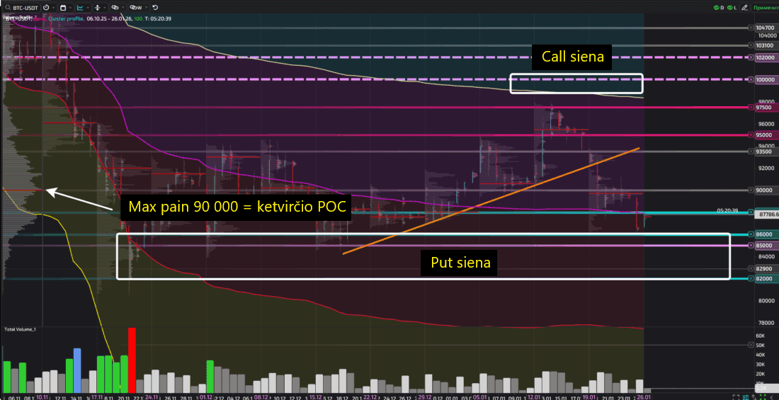 Ką reiškia 90 000 dolerių kaina spotiniame grafike? Tai praėjusios savaitės ir viso ketvirčio kontrolės taškas (POC). Strike 100 000 (call siena) – tai zona, kurios jie net negali pasiekti. Tačiau ir žemiau sienos taip pat nėra jokios vilties: ten kritimas buvo itin agresyviai sustabdytas.