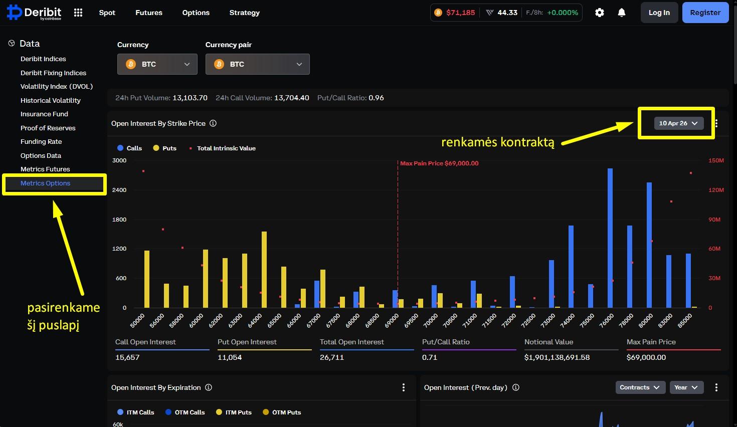 Pagrindinis duomenų apie kriptovaliutų opcionus šaltinis – birža Deribit, kuri užtikrina didelę BTC ir ETH prekybos apimčių dalį.